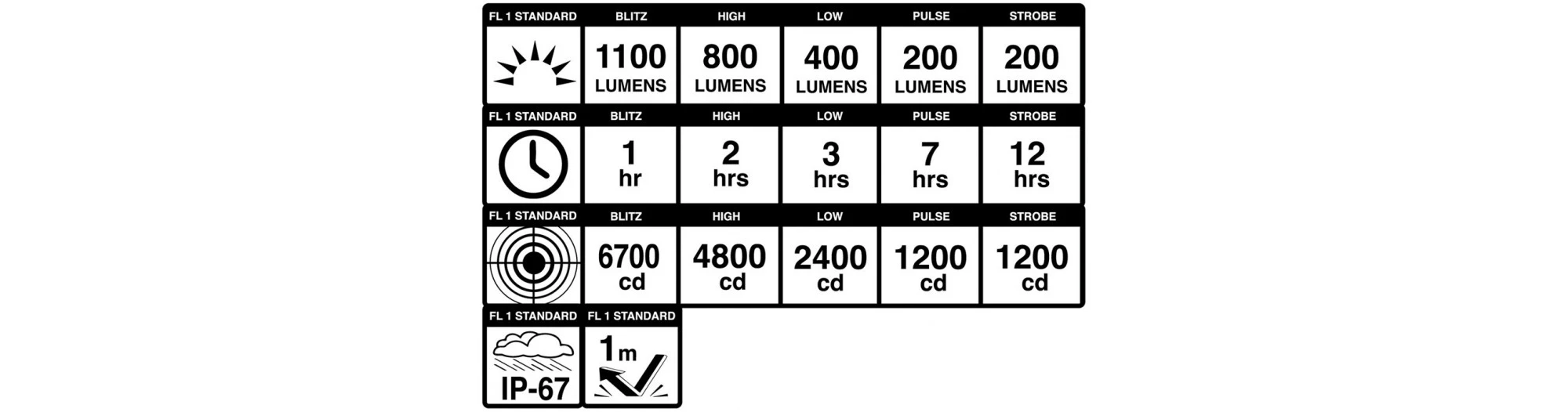- Autonomies: Flash 1,5 heures (1100 lumens), Moyen 2 heures (800 lumens), Bas 3 heures (400 lumens). DurĂ©e d’exĂ©cution : Pulsation/Strobe : 7 heures (200 lumens)/12 heures (200 lumens).