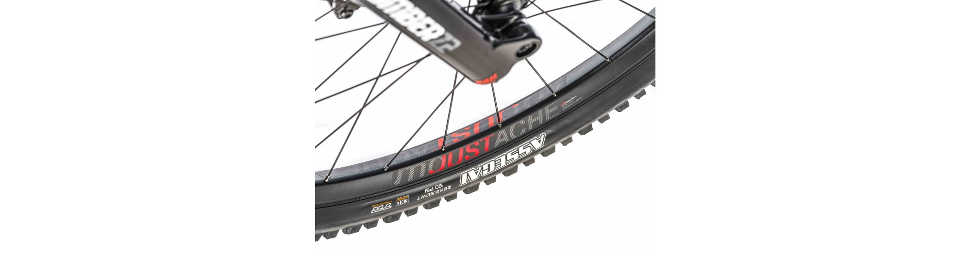 Quant aux roues 29″ avec des jantes aluminium Tubeless Just_Moustache, elles ont Ă©tĂ© dĂ©veloppĂ©es spĂ©cialement par Moustache pour apporter le grip nĂ©cessaire et une rĂ©sistance Ă toute Ă©preuve.