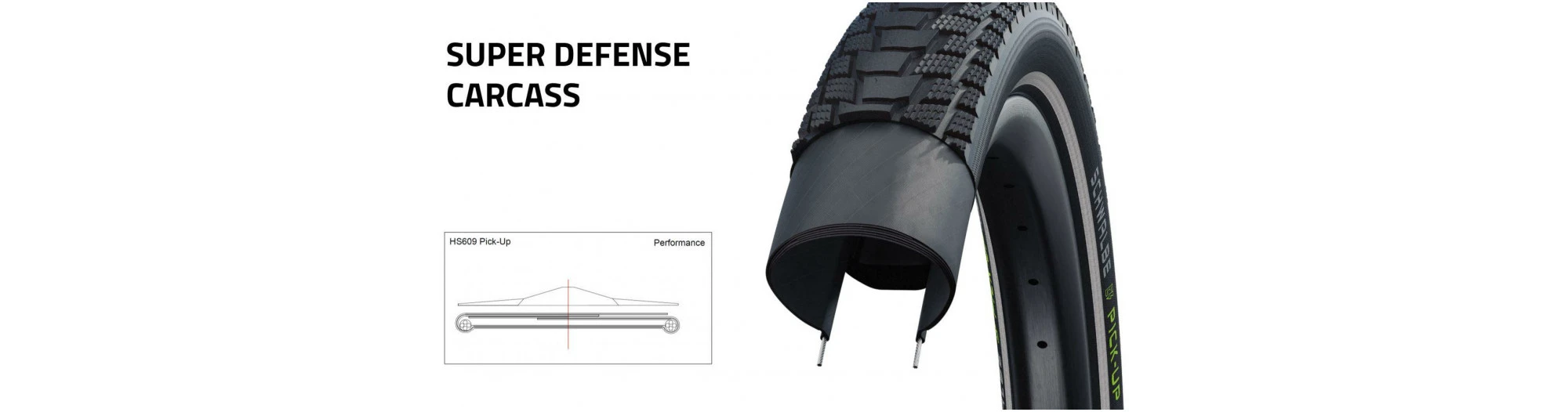 Le Schwalbe Pick-Up est un vrai pneu cargo. Avec sa double carcasse, il est particulièrement rĂ©sistant. Avec une durĂ©e de vie maximale, une faible rĂ©sistance au roulement et un très bon grip, le composĂ© Schwalbe Addix E-Compound est spĂ©cialement optimisĂ© pour les charges Ă©levĂ©es des vĂ©los cargo et des vĂ©los Ă©lectriques. La protection anti-crevaison fiable est assurĂ©e par la bande GreenGuard de trois millimètres d’Ă©paisseur et la carcasse Super Defense. Pour ce pneu, la pression influe fortement sur les performances.CaractĂ©ristiques