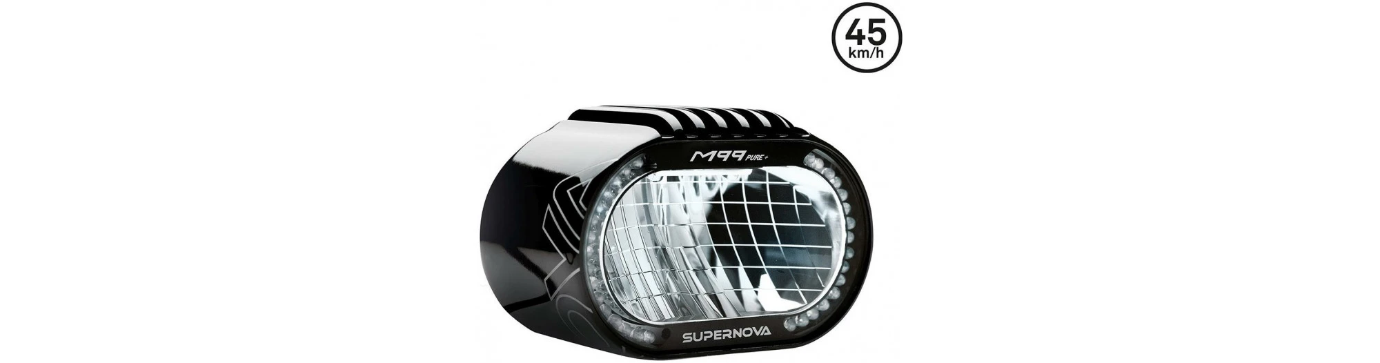 Le feu avant pour vĂ©los Ă©lectriques M99 Pure+ de chez Supernova convainc par ses cinq LED puissantes issues de l’industrie automobile avec une portĂ©e de 380 m et par sa commande intelligente avec capteurs intĂ©grĂ©s pouvant fonctionner sans software pour une utilisation sur tous les vĂ©los Ă©lectriques courants. Le Supernova E-Bike M99 est en outre homologuĂ© pour les vĂ©los Ă©lectriques jusqu’Ă 45 km/h. Sans la fonction feu de route du Supernova M99 Pro!