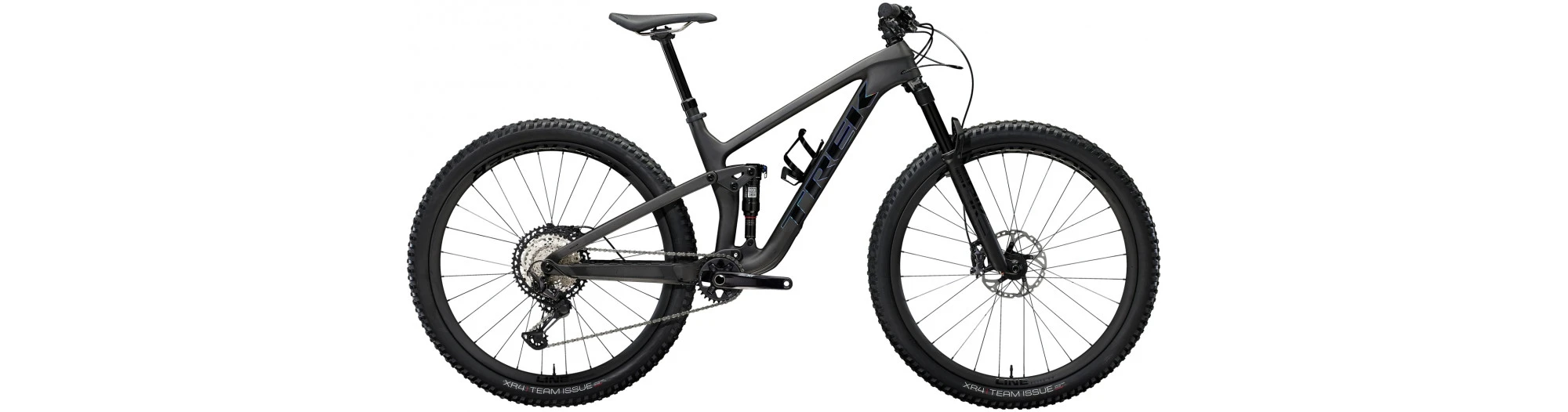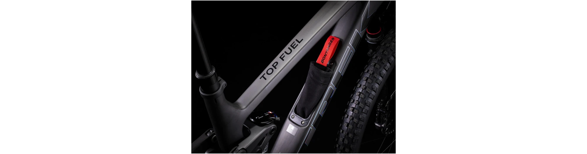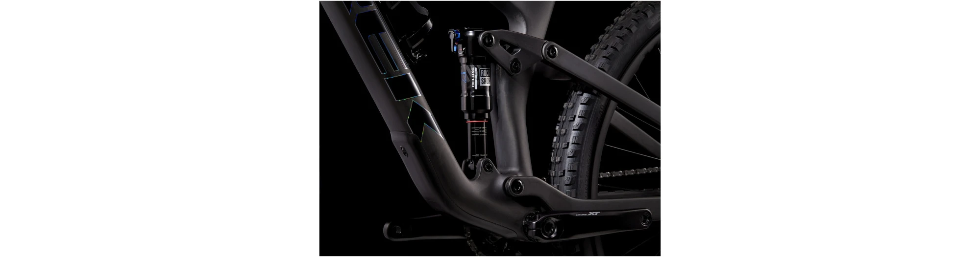 - Un cadre léger et rigide en carbone, une fourche RockShox Pike Select+ de 130 mm, 120 mm de débattement à l’arrière avec un amortisseur RockShox Deluxe Ultimate RCT et une nouvelle transmission monoplateau 12 vitesses Shimano XT. Ajoutez à cela les roues en carbone Bontrager Line Elite 30 avec moyeu Rapid Drive à 108 dents pour un engagement rapide, des freins à 4 pistons pour plus de confiance dans les descentes, la tige de selle télescopique Bontrager Line Elite et un cintre en carbone.