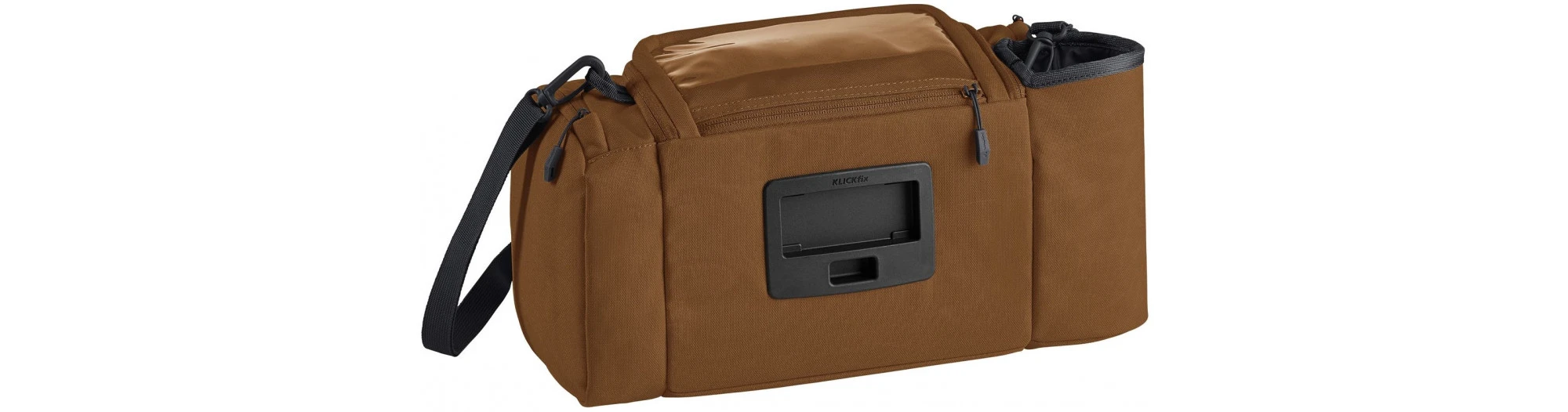 Système de fixation KLICKfixSystème de fixation pour les sacoches de guidon. Le système KLICKfix permet de fixer les sacoches rapidement et en toute sécurité: lors de l’accrochage, l’adaptateur de la sacoche s’encle-nche automatiquement dans le support fixé sur le guidon. Une simple pression sur la touche rouge et la sacoche se détache.